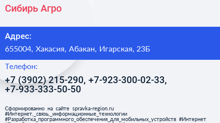 Сибирь-Агро по адресу 655004, Хакасия, Абакан, Игарская, 23Б в дальнейшем Организация, размещена в следующих категориях: