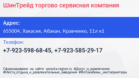 ШинТрейд, торгово-сервисная компания по адресу 655004, Хакасия, Абакан, Кравченко, 11л к1 в дальнейшем Организация, размещена в следующих категориях:
