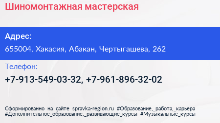 Шиномонтажная мастерская по адресу 655004, Хакасия, Абакан, Чертыгашева, 262 в дальнейшем Организация, размещена в следующих категориях: