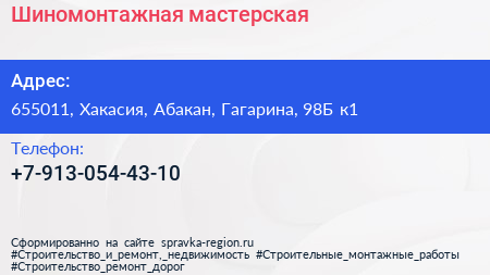 Шиномонтажная мастерская по адресу 655011, Хакасия, Абакан, Гагарина, 98Б к1 в дальнейшем Организация, размещена в следующих категориях: