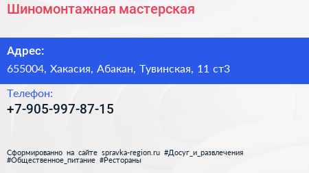 Шиномонтажная мастерская по адресу 655004, Хакасия, Абакан, Тувинская, 11 ст3 в дальнейшем Организация, размещена в следующих категориях:
