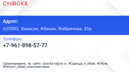 СтоBOXX по адресу 655003, Хакасия, Абакан, Фабричная, 21в в дальнейшем Организация, размещена в следующих категориях: