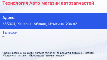 Технология Авто, магазин автозапчастей по адресу 655004, Хакасия, Абакан, Итыгина, 20а к2 в дальнейшем Организация, размещена в следующих категориях: