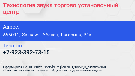 Технология звука, торгово-установочный центр по адресу 655011, Хакасия, Абакан, Гагарина, 94а в дальнейшем Организация, размещена в следующих категориях: