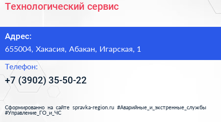 Технологический сервис по адресу 655004, Хакасия, Абакан, Игарская, 1 в дальнейшем Организация, размещена в следующих категориях: