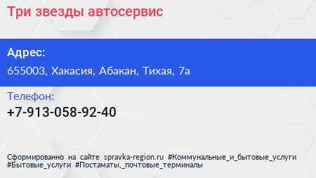 Три звезды, автосервис по адресу 655003, Хакасия, Абакан, Тихая, 7а в дальнейшем Организация, размещена в следующих категориях: