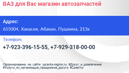 ВАЗ для Вас, магазин автозапчастей по адресу 655004, Хакасия, Абакан, Пушкина, 213х в дальнейшем Организация, размещена в следующих категориях: