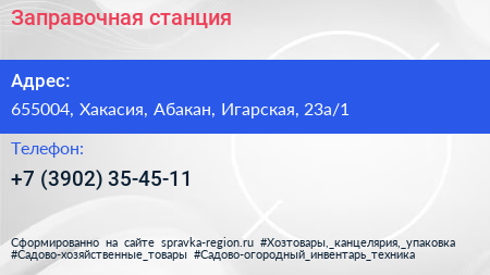 Заправочная станция по адресу 655004, Хакасия, Абакан, Игарская, 23а/1 в дальнейшем Организация, размещена в следующих категориях: