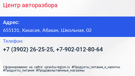 Центр авторазбора по адресу 655131, Хакасия, Абакан, Школьная, 02 в дальнейшем Организация, размещена в следующих категориях: