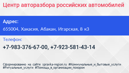 Центр авторазбора российских автомобилей по адресу 655004, Хакасия, Абакан, Игарская, 8 к3 в дальнейшем Организация, размещена в следующих категориях: