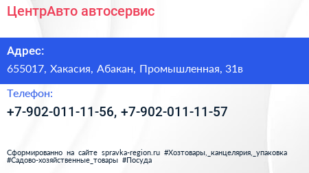 ЦентрАвто, автосервис по адресу 655017, Хакасия, Абакан, Промышленная, 31в в дальнейшем Организация, размещена в следующих категориях: