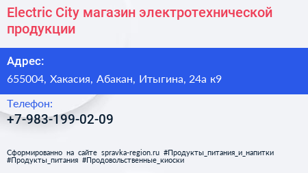 Electric City, магазин электротехнической продукции по адресу 655004, Хакасия, Абакан, Итыгина, 24а к9 в дальнейшем Организация, размещена в следующих категориях: