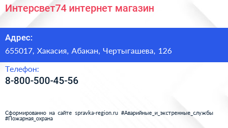 Интерсвет74, интернет-магазин по адресу 655017, Хакасия, Абакан, Чертыгашева, 126 в дальнейшем Организация, размещена в следующих категориях: