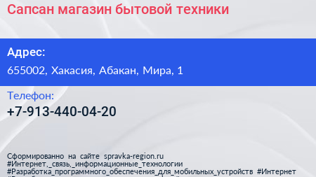 Сапсан, магазин бытовой техники по адресу 655002, Хакасия, Абакан, Мира, 1 в дальнейшем Организация, размещена в следующих категориях:
