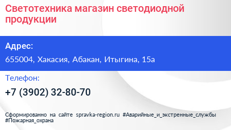 Светотехника, магазин светодиодной продукции по адресу 655004, Хакасия, Абакан, Итыгина, 15а в дальнейшем Организация, размещена в следующих категориях: