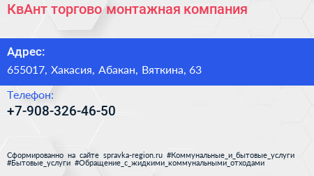 КвАнт, торгово-монтажная компания по адресу 655017, Хакасия, Абакан, Вяткина, 63 в дальнейшем Организация, размещена в следующих категориях: