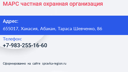 МАРС, частная охранная организация по адресу 655017, Хакасия, Абакан, Тараса Шевченко, 86 в дальнейшем Организация, размещена в следующих категориях: