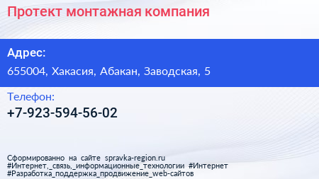 Протект, монтажная компания по адресу 655004, Хакасия, Абакан, Заводская, 5 в дальнейшем Организация, размещена в следующих категориях: