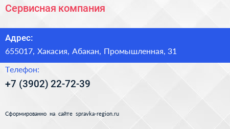 Сервисная компания по адресу 655017, Хакасия, Абакан, Промышленная, 31 в дальнейшем Организация, размещена в следующих категориях: