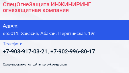 СпецОгнеЗащита-ИНЖИНИРИНГ, огнезащитная компания по адресу 655011, Хакасия, Абакан, Пирятинская, 19г в дальнейшем Организация, размещена в следующих категориях: