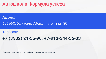 Автошкола Формула успеха по адресу 655650, Хакасия, Абакан, Ленина, 80 в дальнейшем Организация, размещена в следующих категориях: