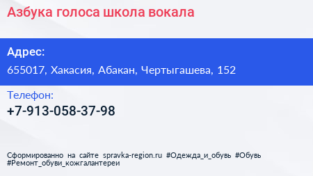 Азбука голоса, школа вокала по адресу 655017, Хакасия, Абакан, Чертыгашева, 152 в дальнейшем Организация, размещена в следующих категориях: