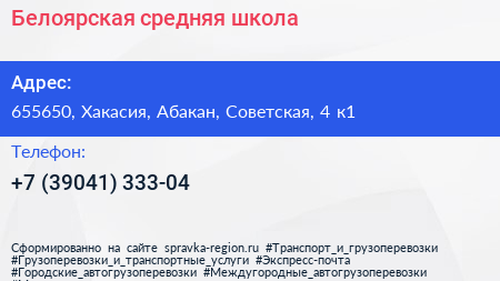 Белоярская средняя школа по адресу 655650, Хакасия, Абакан, Советская, 4 к1 в дальнейшем Организация, размещена в следующих категориях: