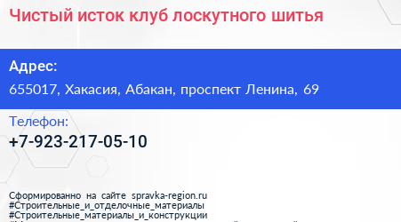 Чистый исток, клуб лоскутного шитья по адресу 655017, Хакасия, Абакан, проспект Ленина, 69 в дальнейшем Организация, размещена в следующих категориях: