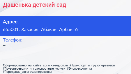 Дашенька, детский сад по адресу 655001, Хакасия, Абакан, Арбан, 6 в дальнейшем Организация, размещена в следующих категориях: