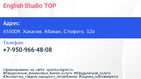 English Studio TOP по адресу 655009, Хакасия, Абакан, Стофато, 12а в дальнейшем Организация, размещена в следующих категориях: