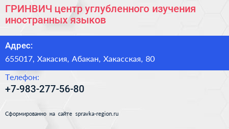 ГРИНВИЧ, центр углубленного изучения иностранных языков по адресу 655017, Хакасия, Абакан, Хакасская, 80 в дальнейшем Организация, размещена в следующих категориях: