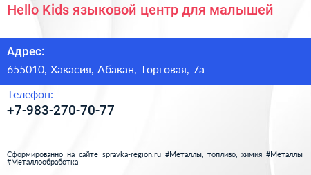 Hello Kids, языковой центр для малышей по адресу 655010, Хакасия, Абакан, Торговая, 7а в дальнейшем Организация, размещена в следующих категориях:
