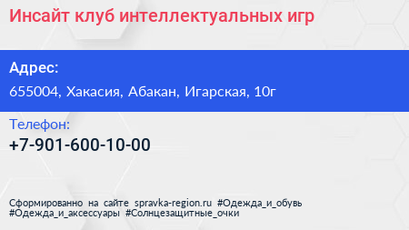 Инсайт, клуб интеллектуальных игр по адресу 655004, Хакасия, Абакан, Игарская, 10г в дальнейшем Организация, размещена в следующих категориях: