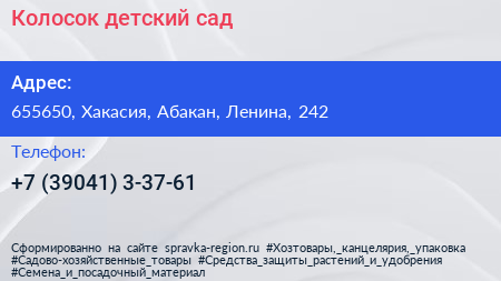 Колосок, детский сад по адресу 655650, Хакасия, Абакан, Ленина, 242 в дальнейшем Организация, размещена в следующих категориях: