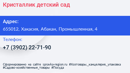 Кристаллик, детский сад по адресу 655012, Хакасия, Абакан, Промышленная, 4 в дальнейшем Организация, размещена в следующих категориях: