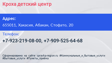 Кроха, детский центр по адресу 655011, Хакасия, Абакан, Стофато, 20 в дальнейшем Организация, размещена в следующих категориях: