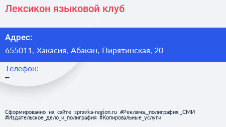 Лексикон, языковой клуб по адресу 655011, Хакасия, Абакан, Пирятинская, 20 в дальнейшем Организация, размещена в следующих категориях: