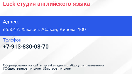 Luck, студия английского языка по адресу 655017, Хакасия, Абакан, Кирова, 100 в дальнейшем Организация, размещена в следующих категориях: