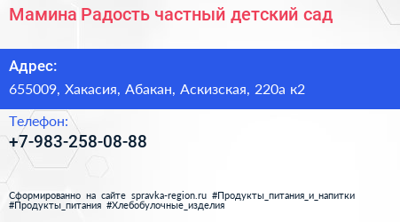 Мамина Радость, частный детский сад по адресу 655009, Хакасия, Абакан, Аскизская, 220а к2 в дальнейшем Организация, размещена в следующих категориях: