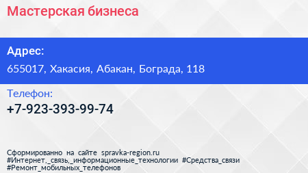 Мастерская бизнеса по адресу 655017, Хакасия, Абакан, Бограда, 118 в дальнейшем Организация, размещена в следующих категориях: