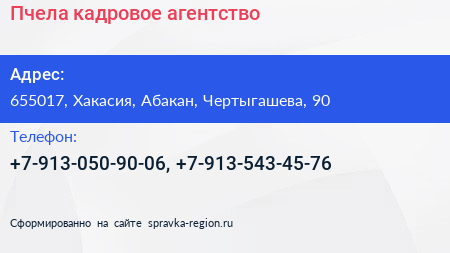 Пчела, кадровое агентство по адресу 655017, Хакасия, Абакан, Чертыгашева, 90 в дальнейшем Организация, размещена в следующих категориях: