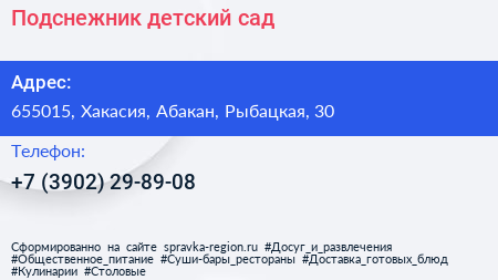 Подснежник, детский сад по адресу 655015, Хакасия, Абакан, Рыбацкая, 30 в дальнейшем Организация, размещена в следующих категориях: