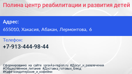 Полина, центр реабилитации и развития детей по адресу 655010, Хакасия, Абакан, Лермонтова, 6 в дальнейшем Организация, размещена в следующих категориях: