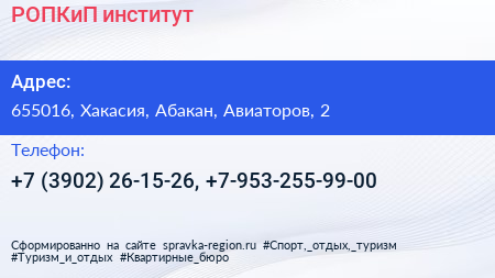 РОПКиП, институт по адресу 655016, Хакасия, Абакан, Авиаторов, 2 в дальнейшем Организация, размещена в следующих категориях:
