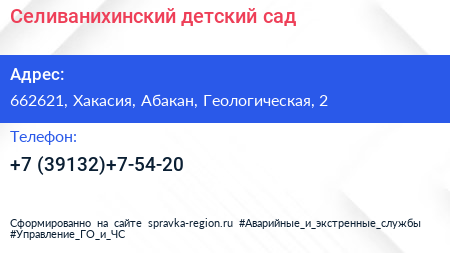 Селиванихинский детский сад по адресу 662621, Хакасия, Абакан, Геологическая, 2 в дальнейшем Организация, размещена в следующих категориях: