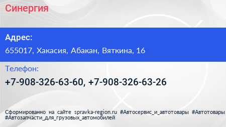 Синергия по адресу 655017, Хакасия, Абакан, Вяткина, 16 в дальнейшем Организация, размещена в следующих категориях: