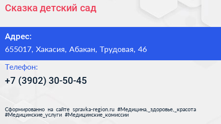 Сказка, детский сад по адресу 655017, Хакасия, Абакан, Трудовая, 46 в дальнейшем Организация, размещена в следующих категориях: