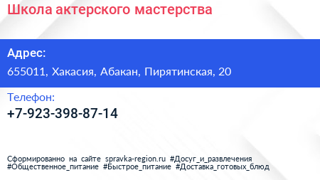 Школа актерского мастерства по адресу 655011, Хакасия, Абакан, Пирятинская, 20 в дальнейшем Организация, размещена в следующих категориях: