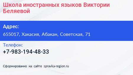 Школа иностранных языков Виктории Беляевой по адресу 655017, Хакасия, Абакан, Советская, 71 в дальнейшем Организация, размещена в следующих категориях: