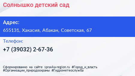 Солнышко, детский сад по адресу 655131, Хакасия, Абакан, Советская, 67 в дальнейшем Организация, размещена в следующих категориях: